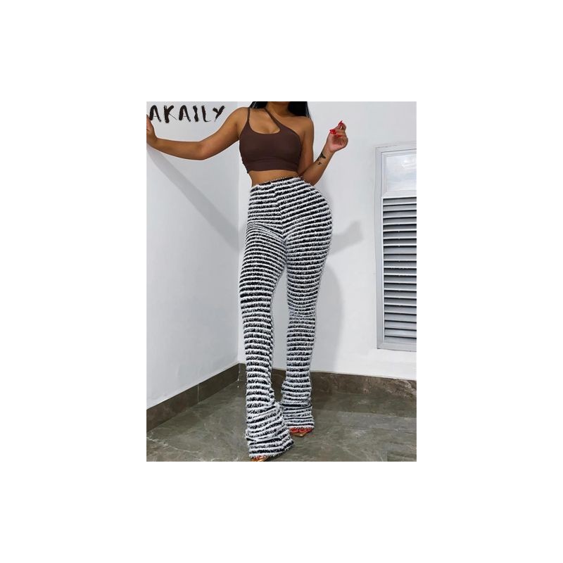 Akaily Fall Woolen Knitted Pants For Women Fashion 2022 High Wasit Skinny Flare Pants Ladies Black Striped Casual Long Trousers
