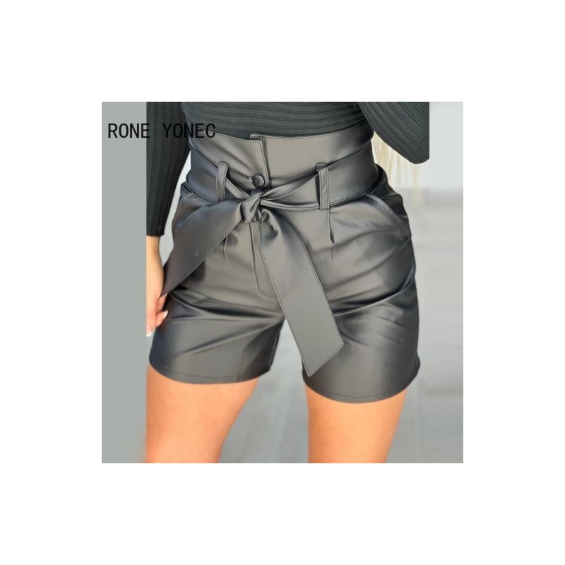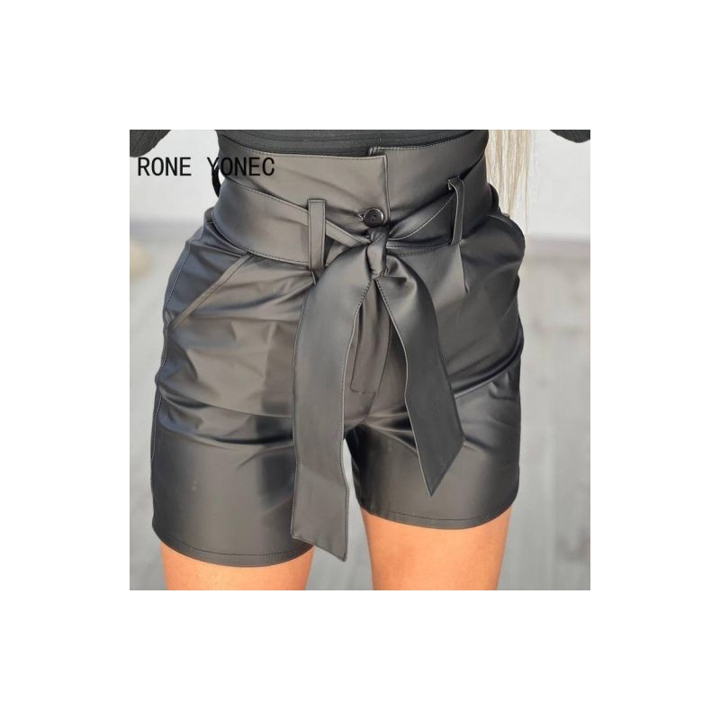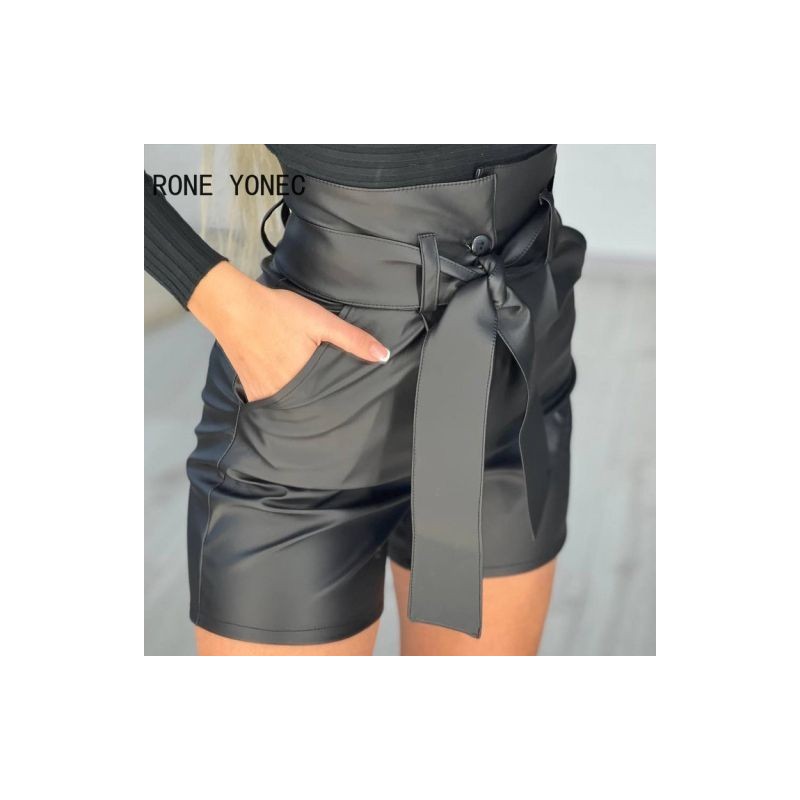 Women Casual High Waist with Belt Pu Leather Skinny Straight Black Shorts