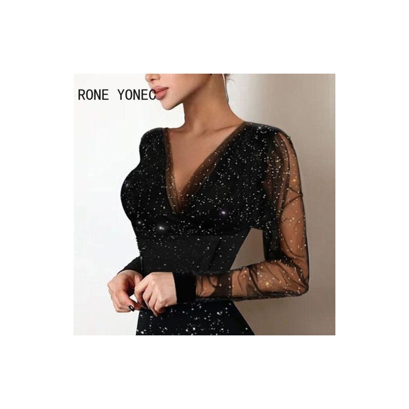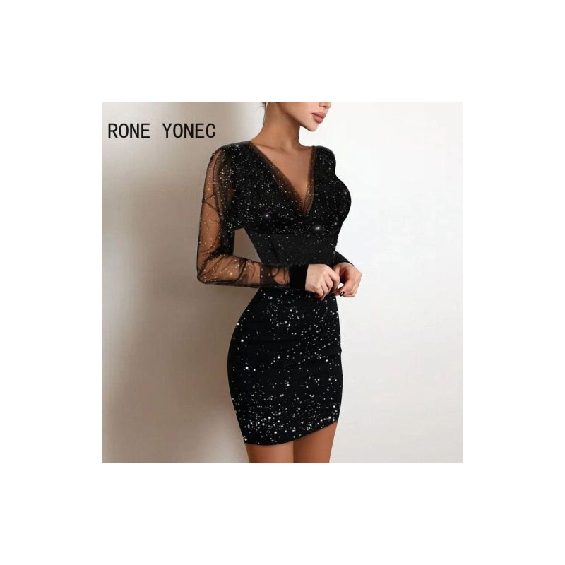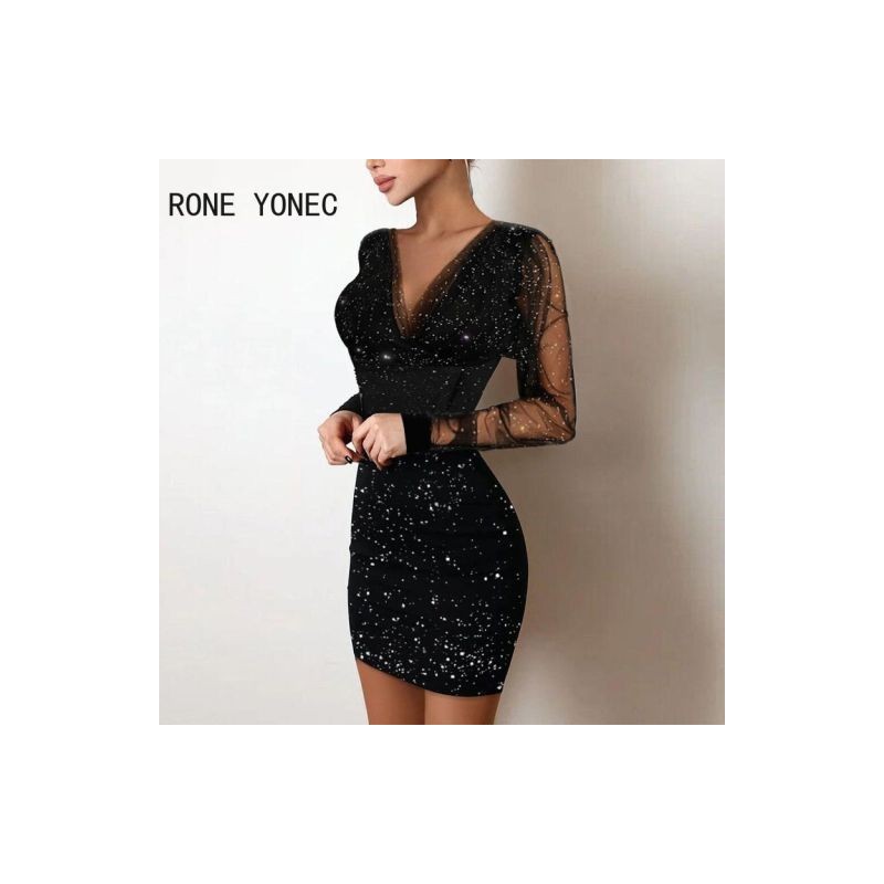 Női Elegáns Elegáns Hálós Patchwork Mély V nyakú, Hosszú ujjú Csillogó Mini Party Szexi Bodycon Fekete ruhák