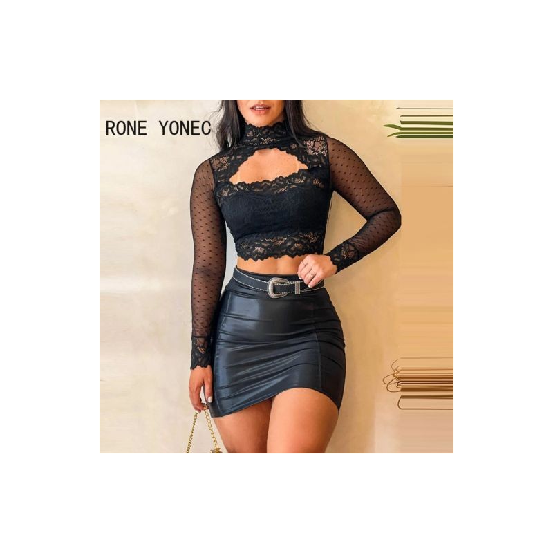 Női elegáns, hosszú ujjú rövid csipke felsők pu bőr alsó övgombbal Bodycon mini szexi szoknya szettek