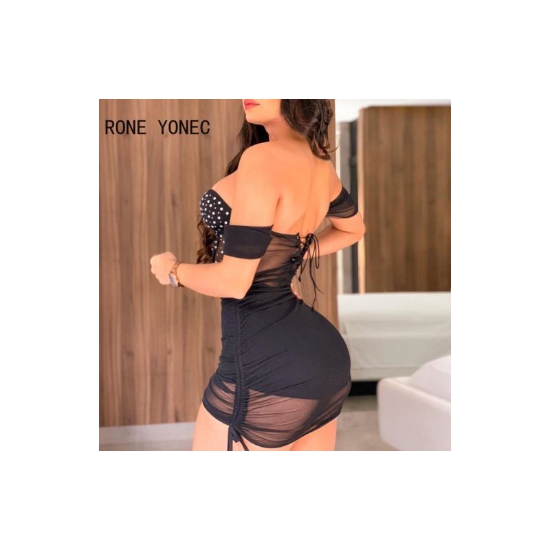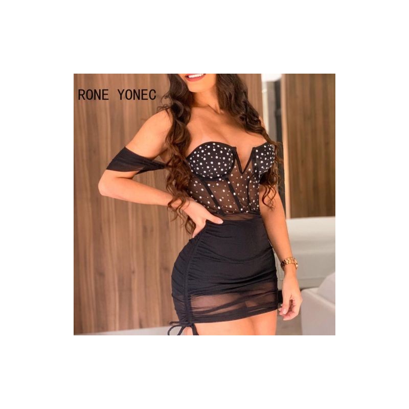 Women Solid Sexy Off Shoulder Rhinestone Mesh Patchwork Bodycon Mini Sexy Party Dresses Set