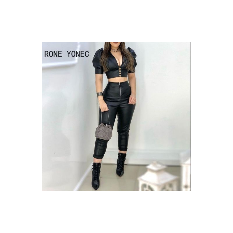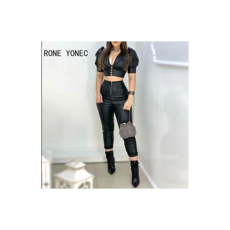 Női tömör, rövid, puffos ujjú, alkalmi Crop gomb, világos vonalú dekoráció vékony fekete nadrágszettek