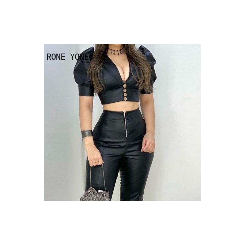 Women Solid Short Puff Sleeves Casual Crop button Bright Line Decoration Skinny Black Pant Sets