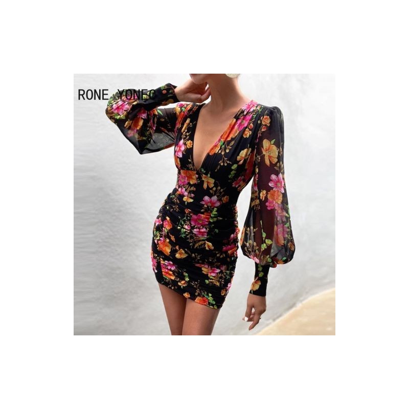Women Floral Print V-neck Lantern Sleeve Tight Waist Dress Vacation Dress 2021