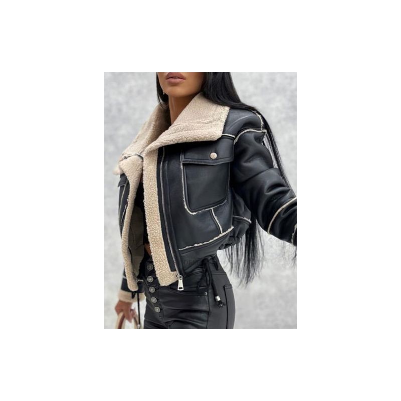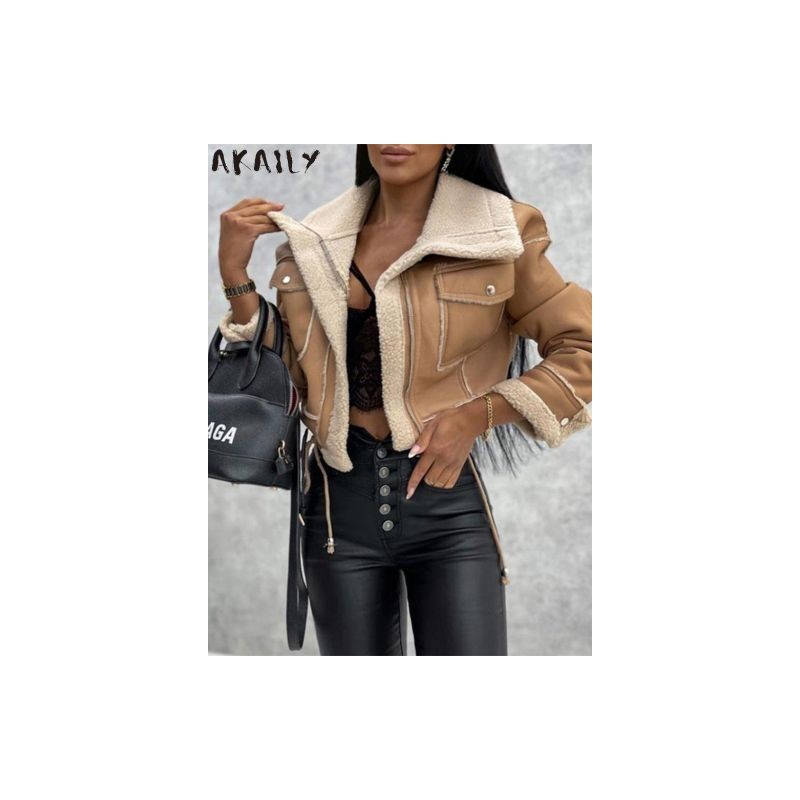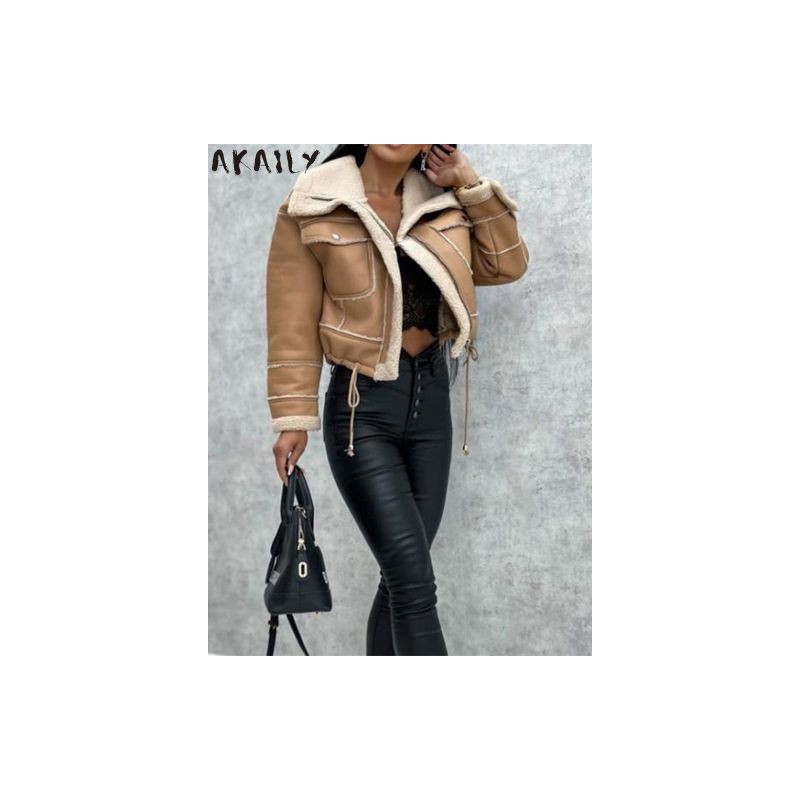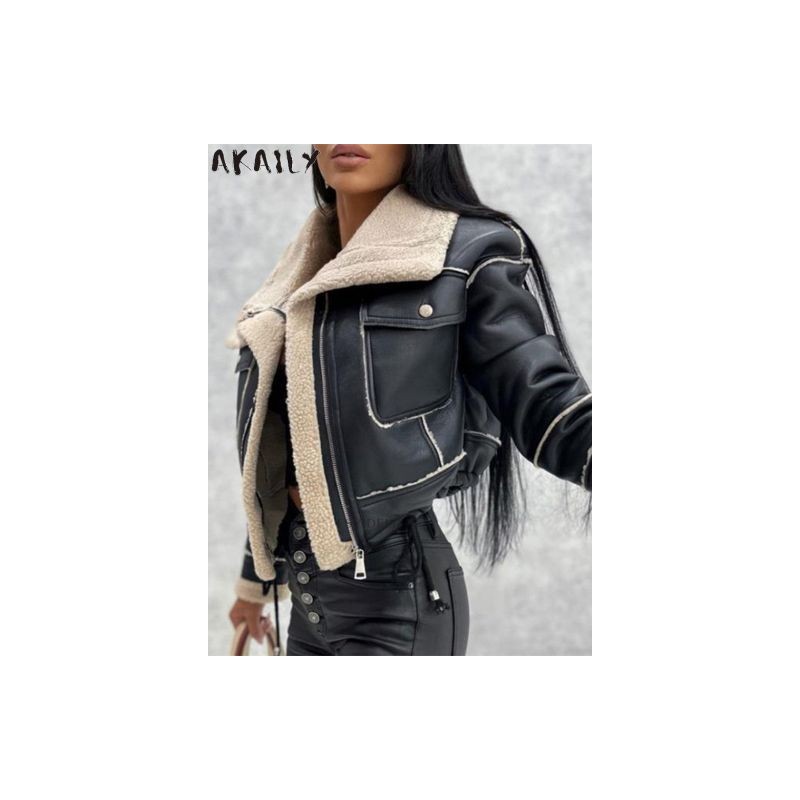 Akaily őszi gyapjú patchwork dzsekik női divat 2022 fekete V nyakú hosszú ujjú kabát női alkalmi polár cipzáras dzsekik