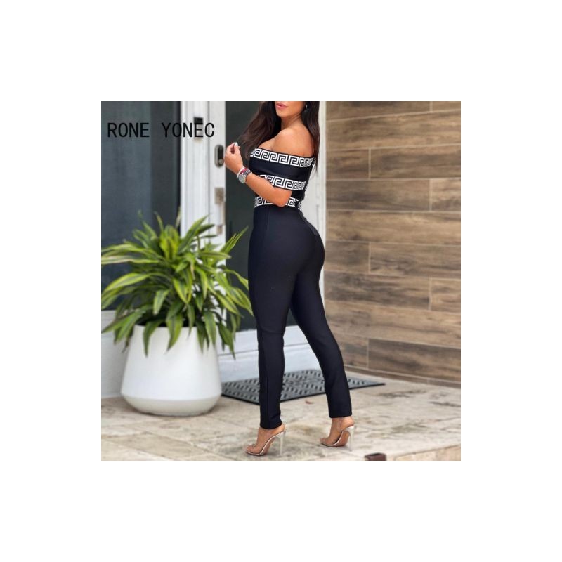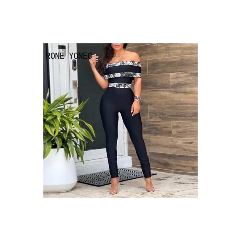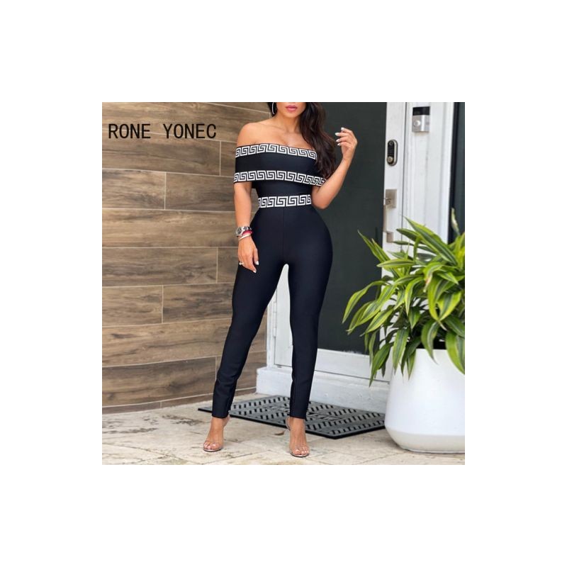 Women Elegant Geometric Print Slash Neck Skinny Casual Working Jumpsuit