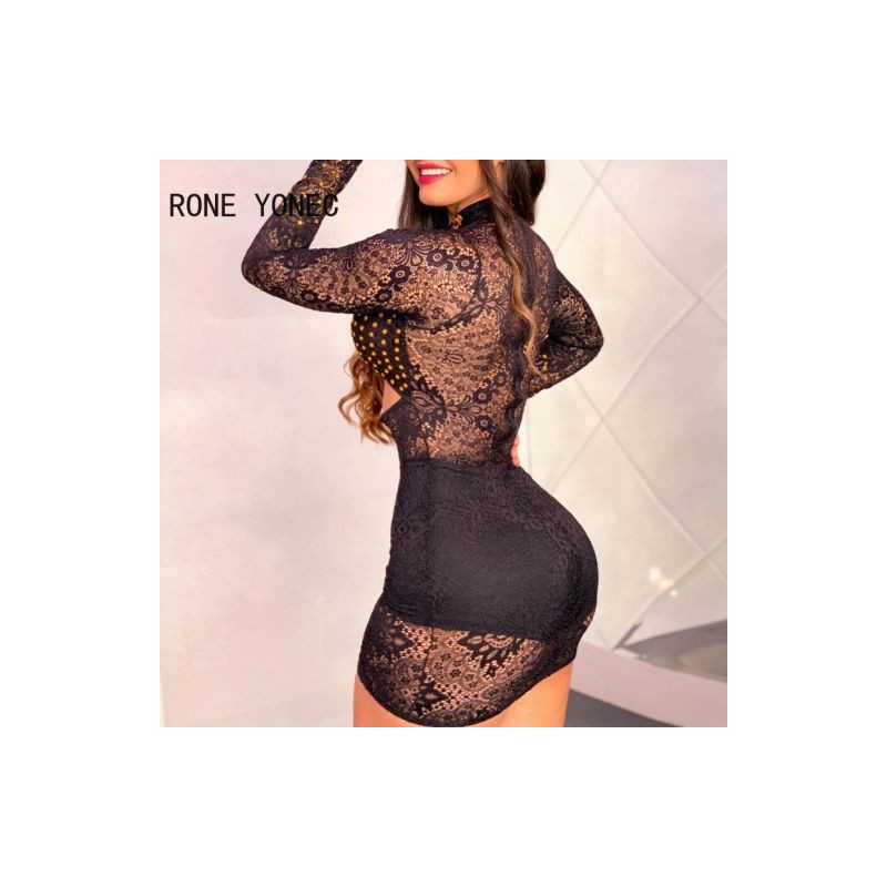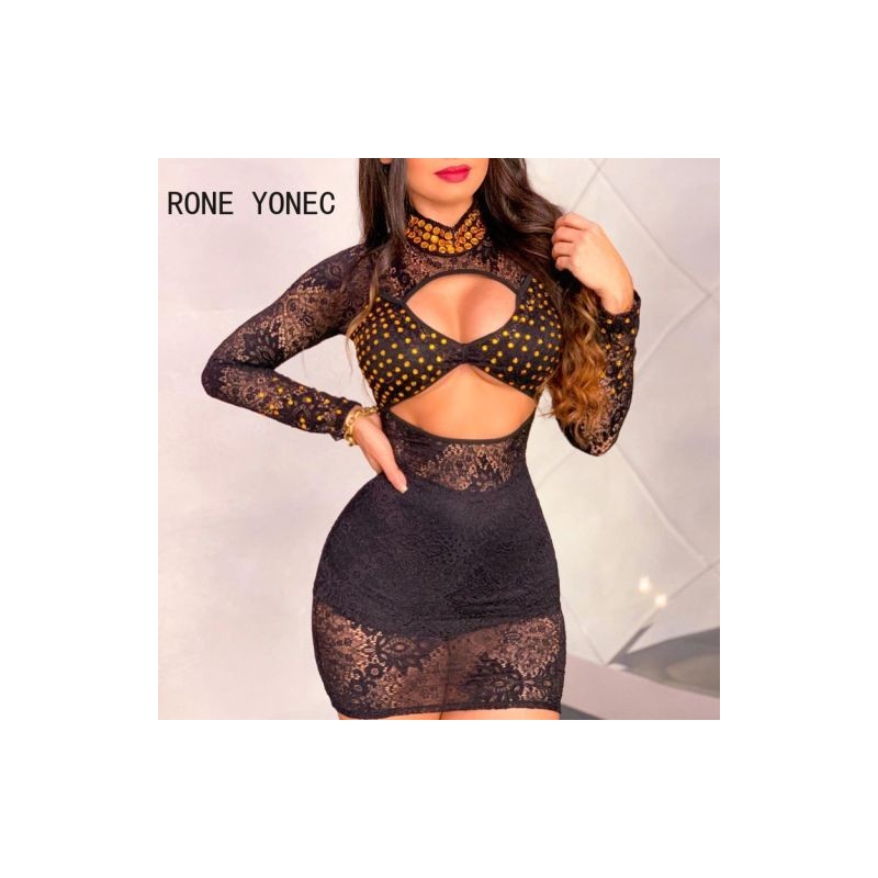 Női tömör csipke strassz dekoráció, üreges kivágás Bodycon mini szexi ruhaszett