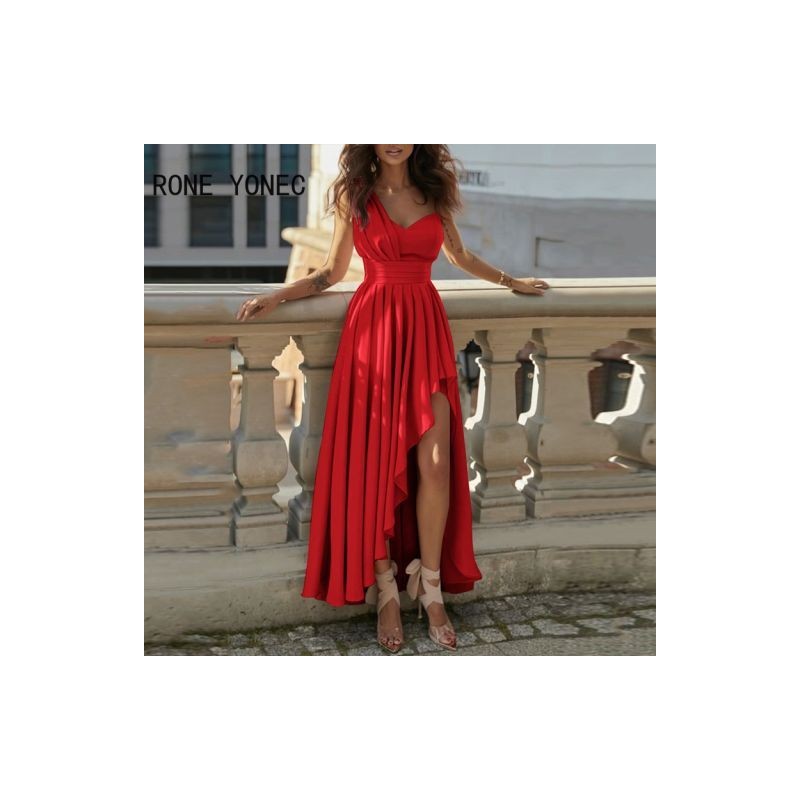 Women Solid Elegant One Shoulder Asymmetrical High Silt Maxi Sexy Formal Party Dresses