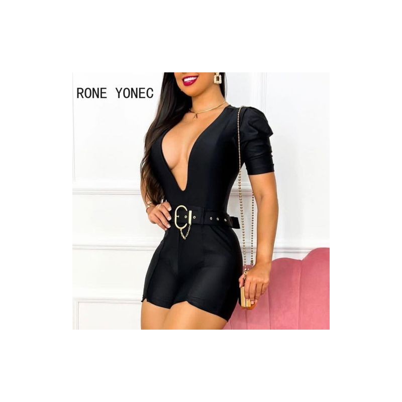 2023 Women Sexy Deep V Neck Short Puff Sleeves with Belts Chain Decor Skinny Black Rompers