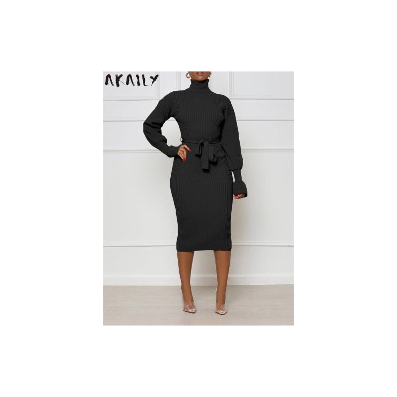 Akaily Fall Black Knitted Maxi Dresses For Women Fashion 2022 Turtleneck Long Sleeve Casual Dress Ladies Bandage Long Dress