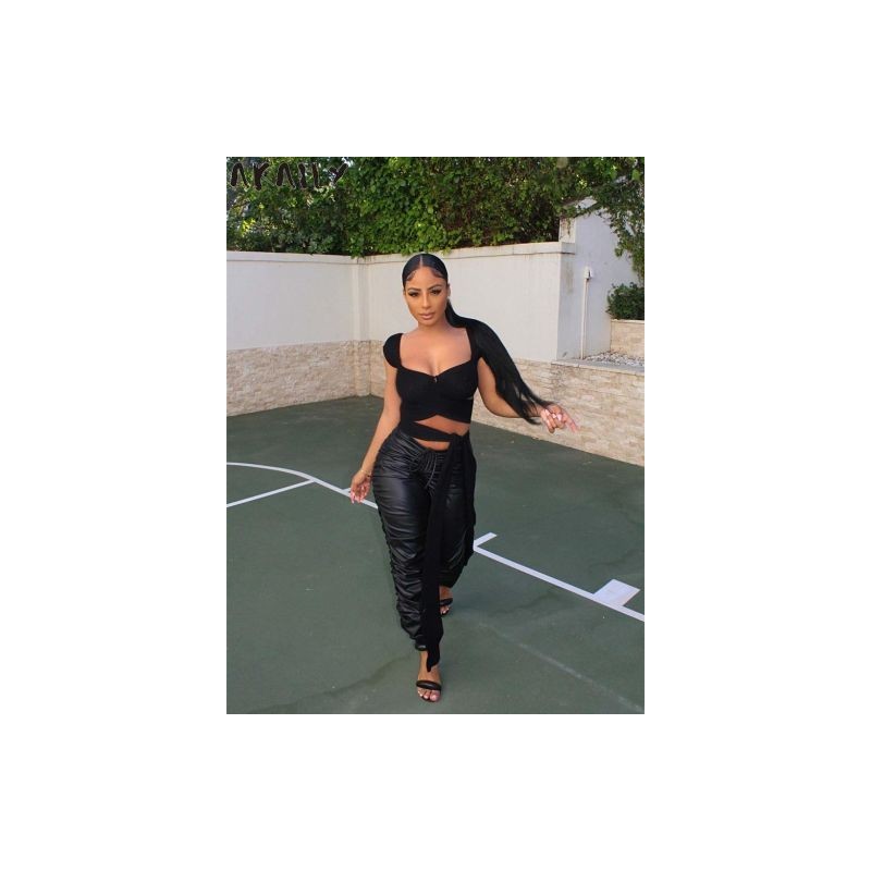 Akaily Fall Black Faux Leather Pants For Women Streetwear 2022 Low Rise Drawstring Baggy Pants Ladies Pu Casual Long Trousers