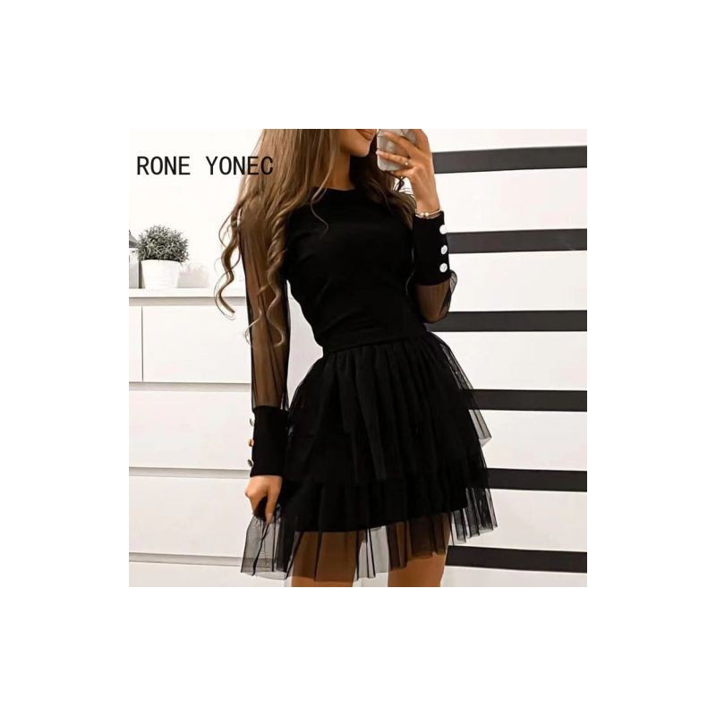 Női elegáns, csillogó kontrasztos hálós, kerek nyakú, A-vonalú, gombdekorációs alkalmi ruha