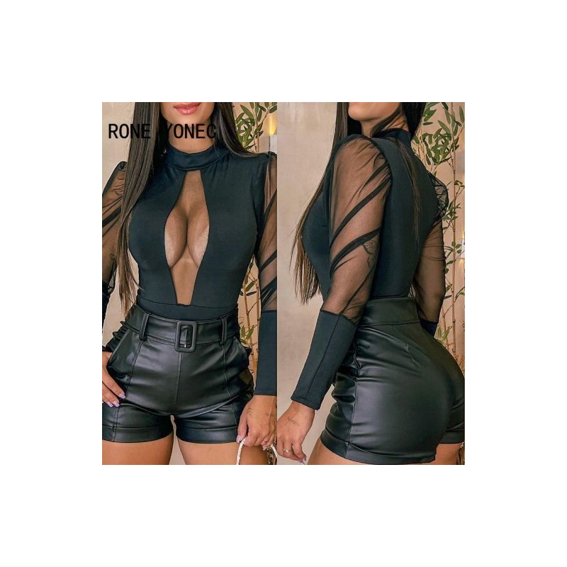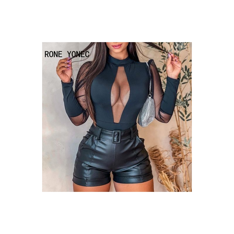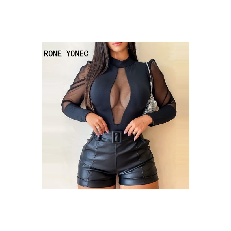 Women Chic Solid Mesh Turtleneck Patchwork Long Sleeves Bodycon Sexy Blouse Tops