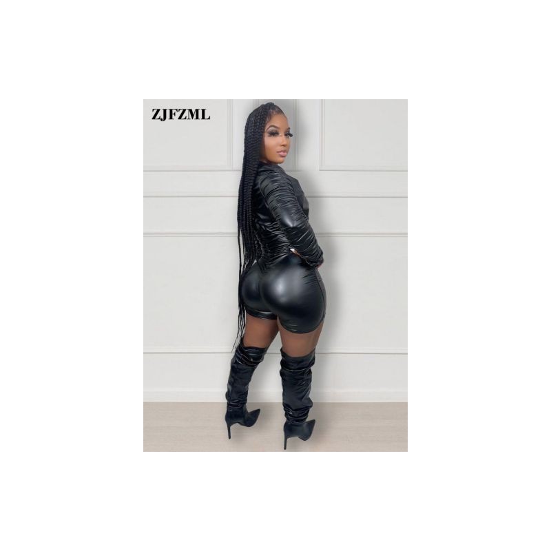 PU műbőr ruched Rompers Női Jumpsuits Vintage Plunge V dekoltázs hosszú ujjú overál Moto Biker Good Elastic Playsuit