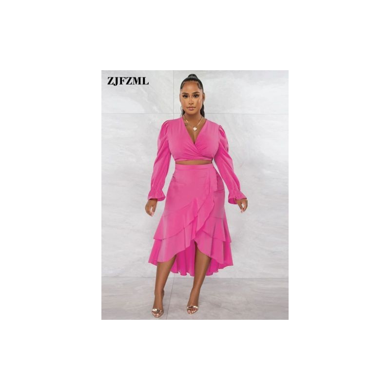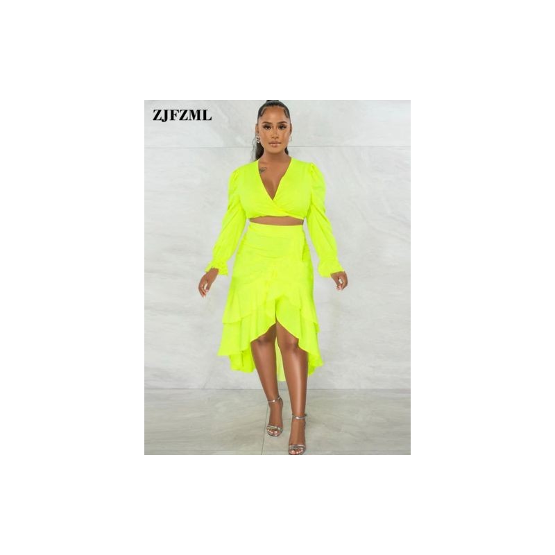 Fluorescent Green Two Piece Dress Suits Classic Woman Deep V Neck Puff Long Sleeve Crop Top and Ruffle Patchwork Mermaid Skirts
