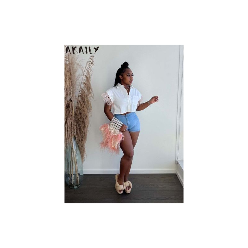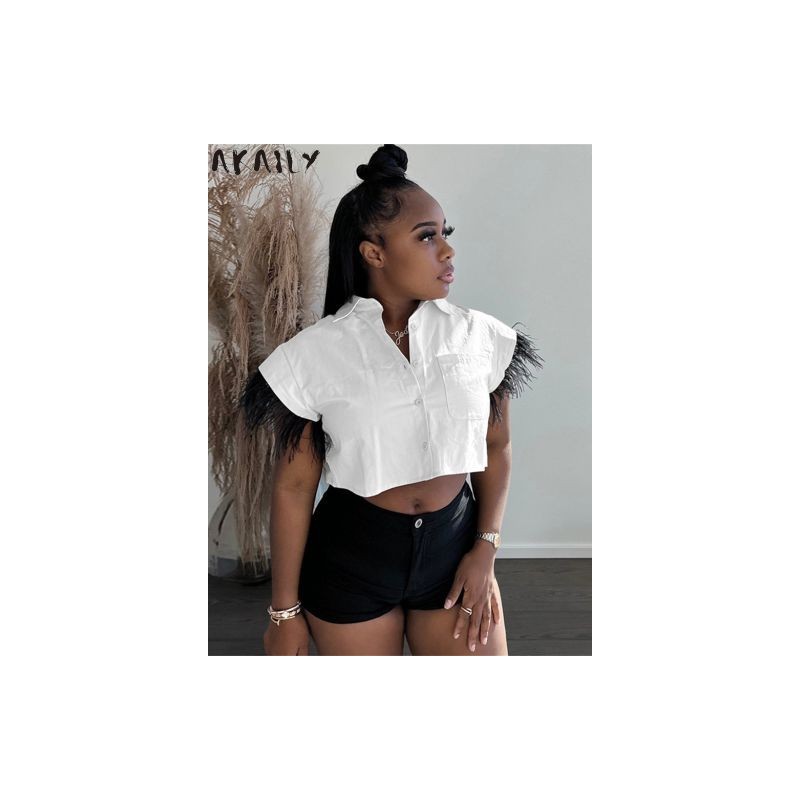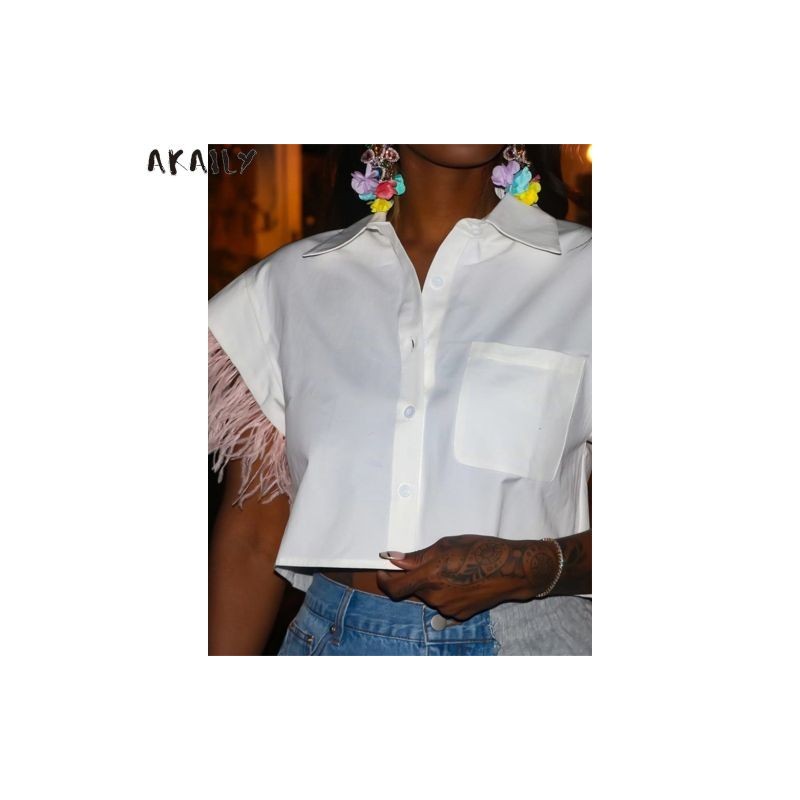 Akaily Summer Street White Tassel Shirts For Women 2022 Short Sleeve Button Blouses Female Solid Feather Sleeve Short Tops