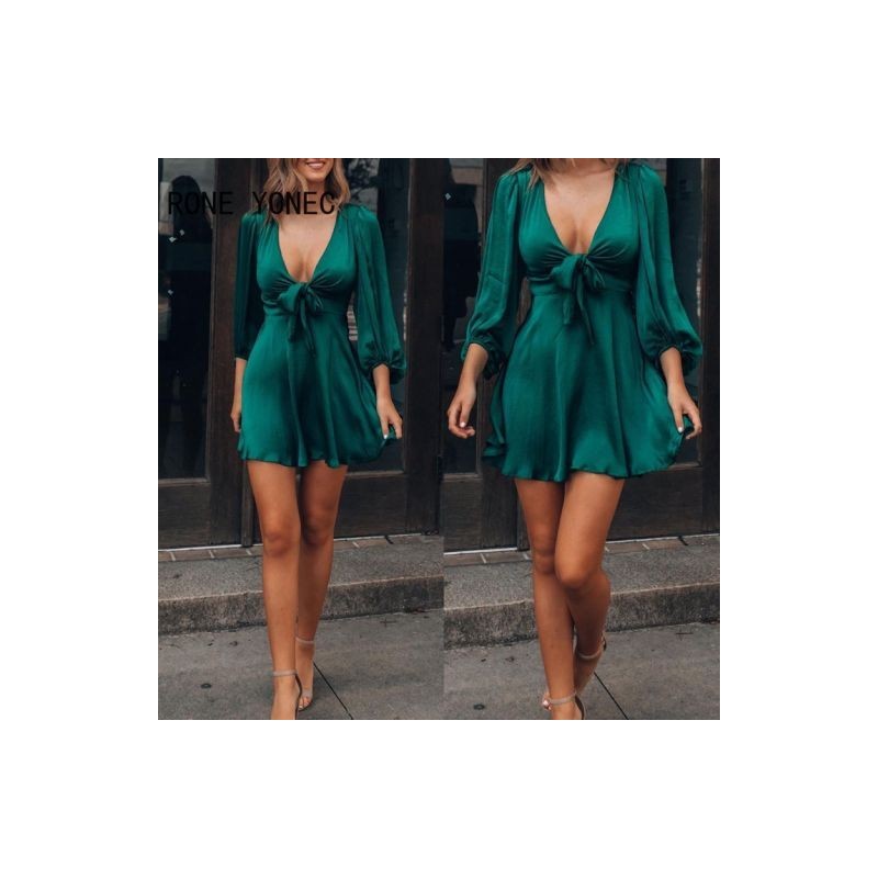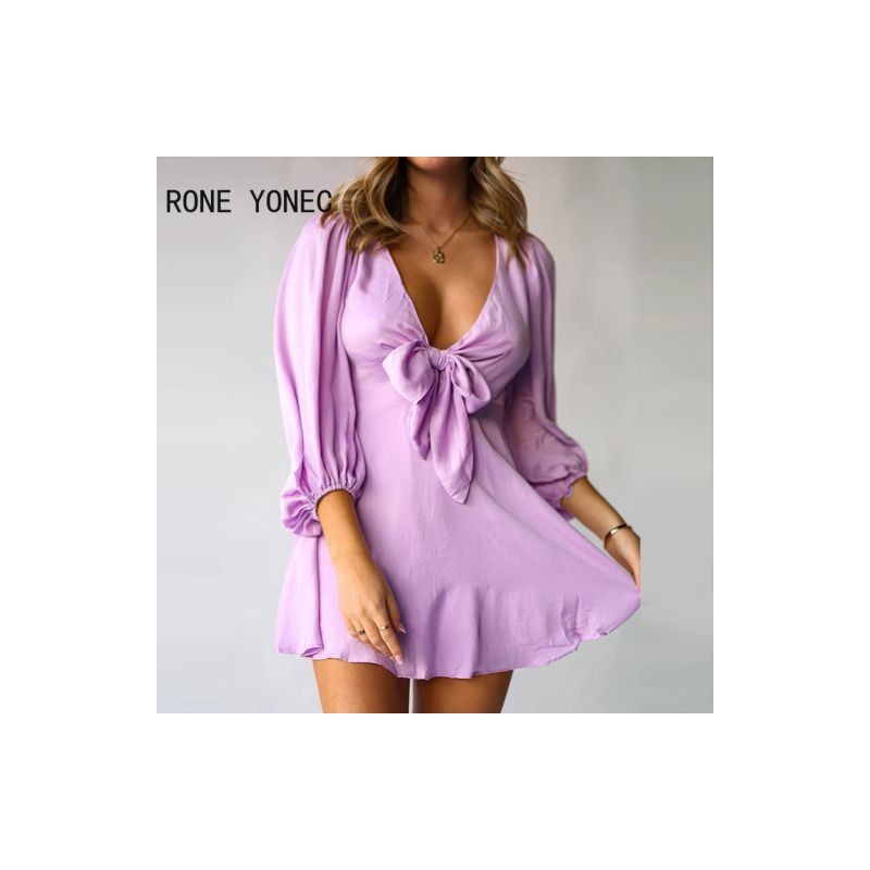Women Elegant Dress Puff Sleeve Plunge Tie Front Dress Casual Dress Summer Dress