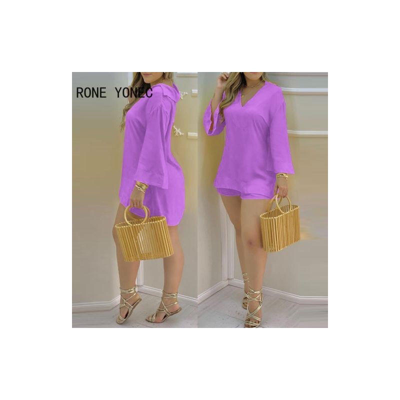 Women Two Piec Set Solid Plain Bell Sleeve V-Neck Top & Shorts Set Outfit Summer suit