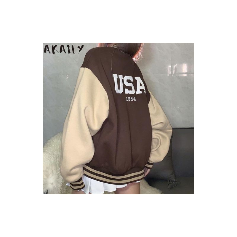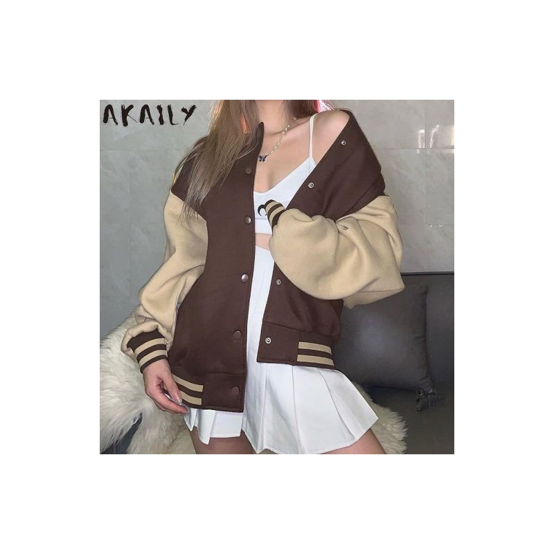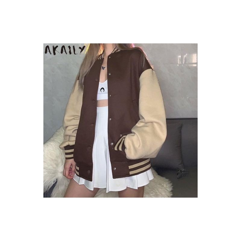Akaily Autumn Patchwork Oversized Jackets For Women 2021 Brown Varsity Baseball Jacket Ladies Letter Long Sleeve Cardigan Coat
