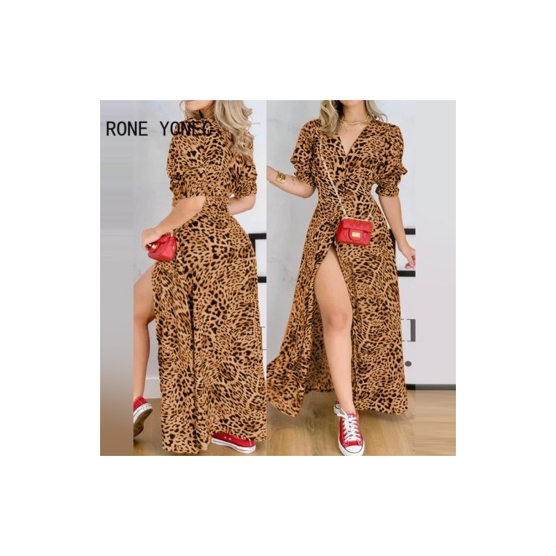 Női, gepárdmintás, felfújt ujjú, magasan hasított ingruha, nyaralóruha, 2021