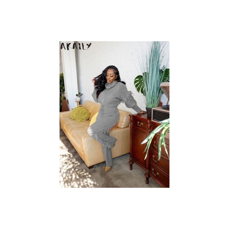 Akaily Fall Brown Knitted 2 Two Piece Sets Womens Casual Outfits 2022 Pink Turtleneck Long Sleeve Sweater And Pants Sets Ladies