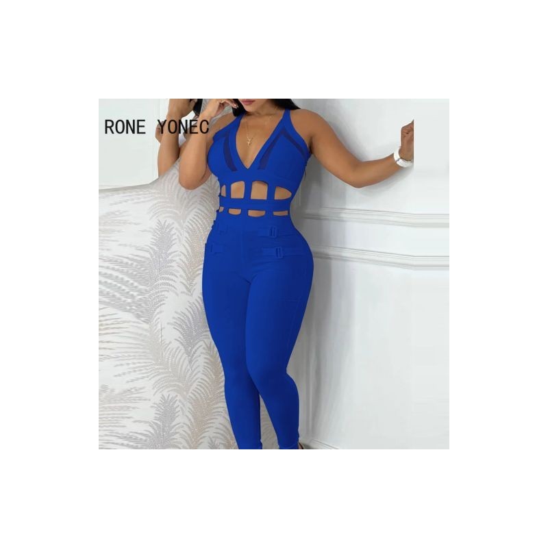 2023 Women Casual Solid Halter Hollow Out Deep V Neck Hole Sleeveless Bandage Jumpsuit