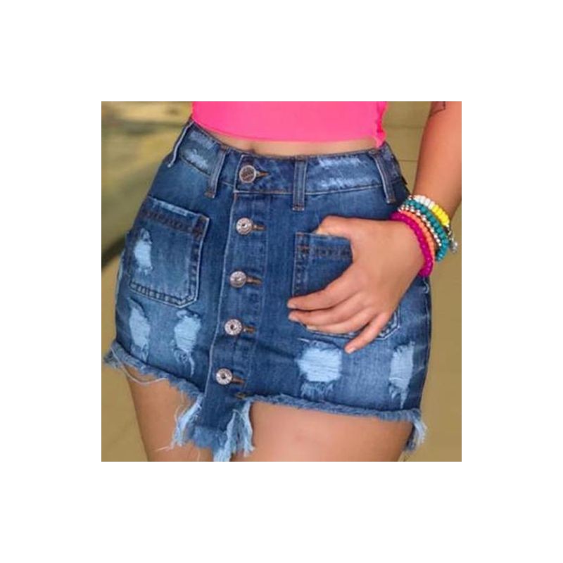 2023 Women Multi-breasted Pocket Solid Asymmetrical Ripped Decor Denim Skirts