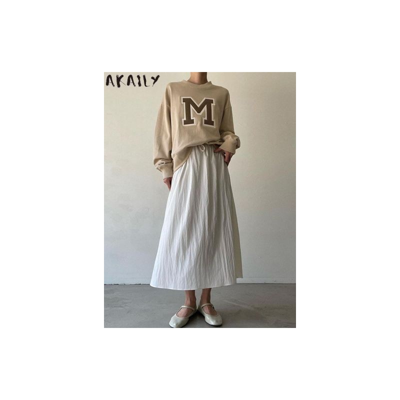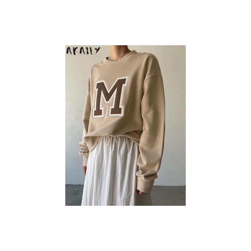 Akaily Fall Letter Embroidery Hoodies For Women Fashion 2022 O Neck Long Sleeve Tops Ladies Khaki Casual Crewneck Sweatshirts
