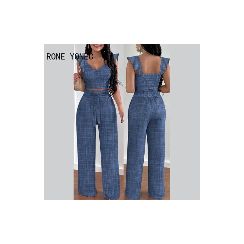 Women Casual Flying Sleeves Pleated Lace Up High Elastic Waist Straight Leg Pants Sets