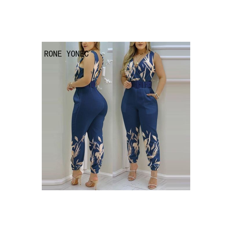 Women Elegant Sexy Deep V Neck Printing Pocket Sashes Pencil Pants Working Jumpsuit
