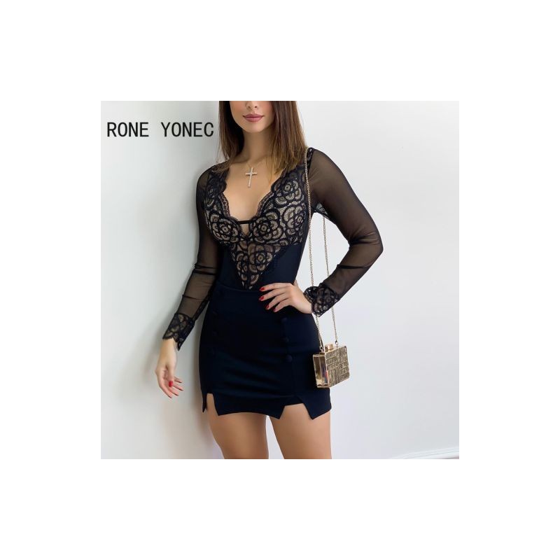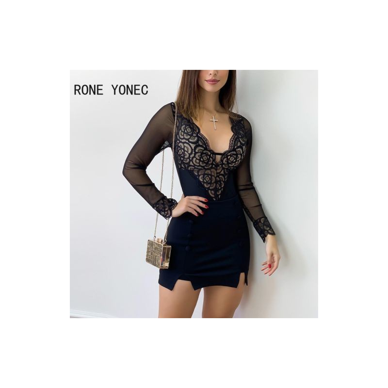 Női szexi patchwork csipke hosszú ujjú gombos, mély V nyakú Bodycon mini szexi parti ruhák