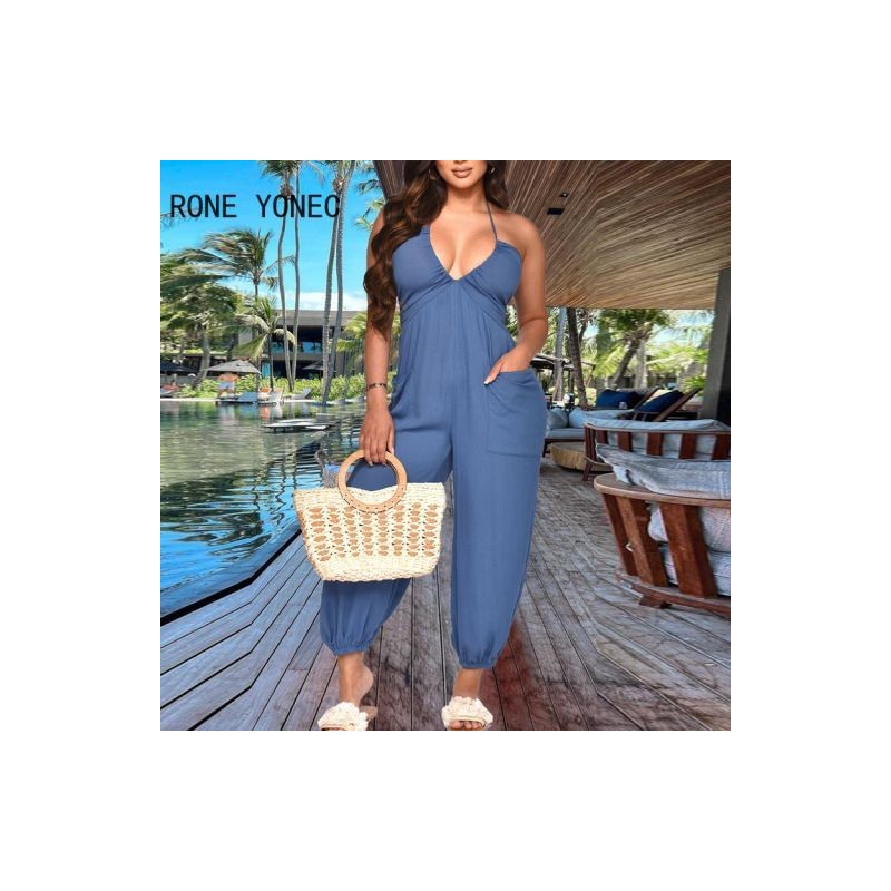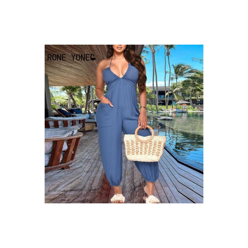 2023 Women Solid Elegant Spaghetti Straps Halter Deep V Neck Pocket Folds Sexy Jumpsuit