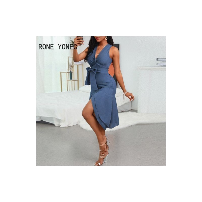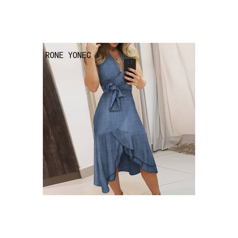 Women Chic Elegant Solid with Belt Sleeveless Deep V Neck Ruffle Midi Working Dresses