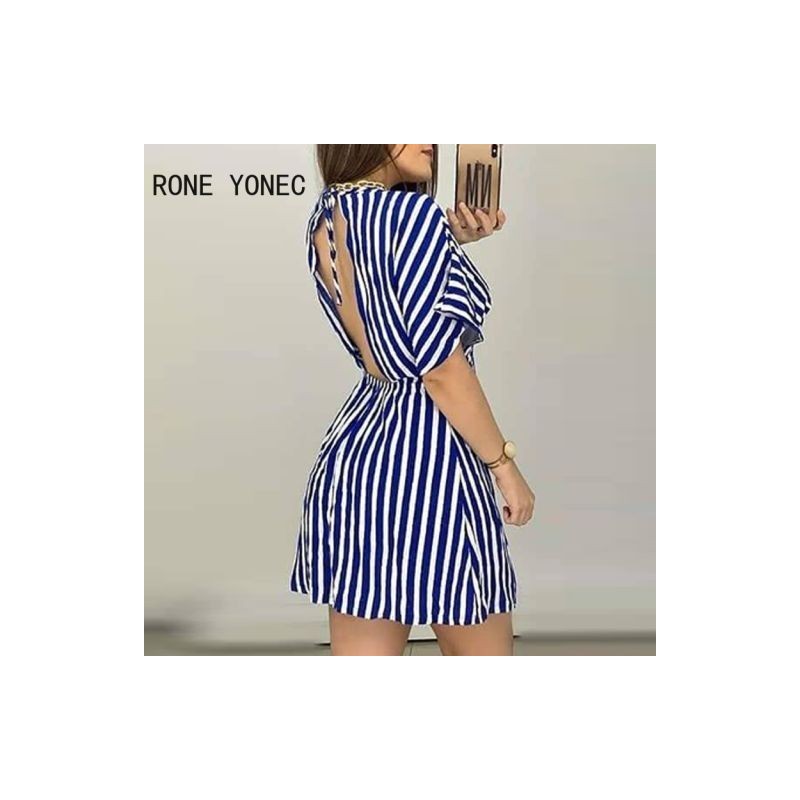 Women Stripe Print V-neck Tight Waist Backless Dress Casual Vacation Dress 2021
