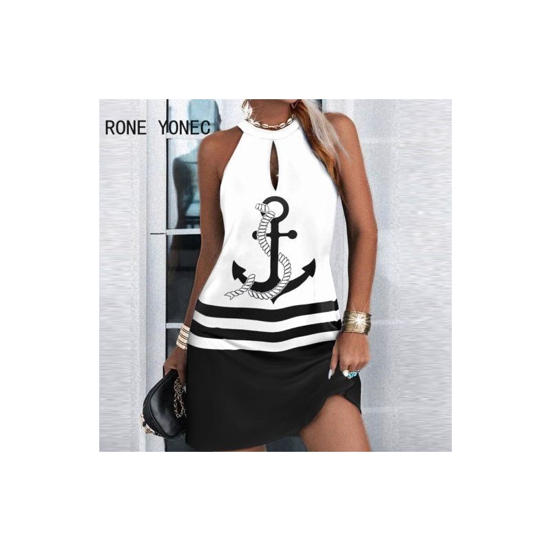 Women Chic Hollow Out Halter Sleeveless Sailing Series Pattern A-line Party Mini Sexy Dress