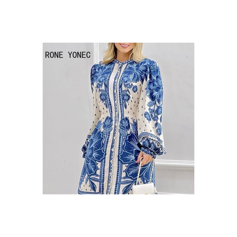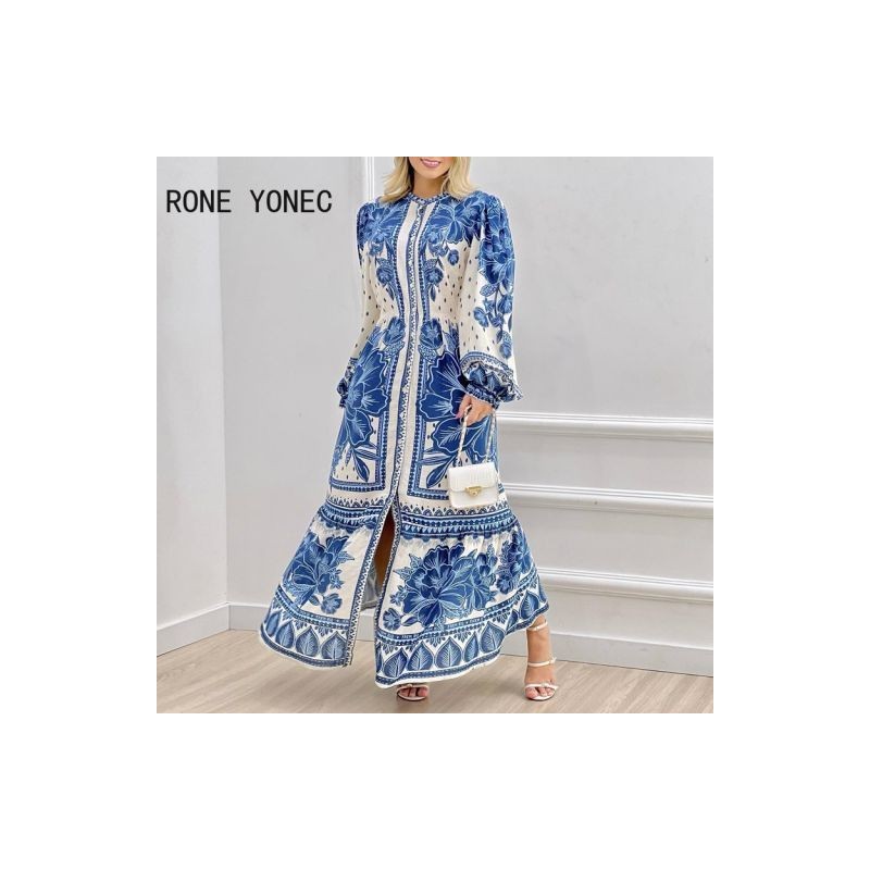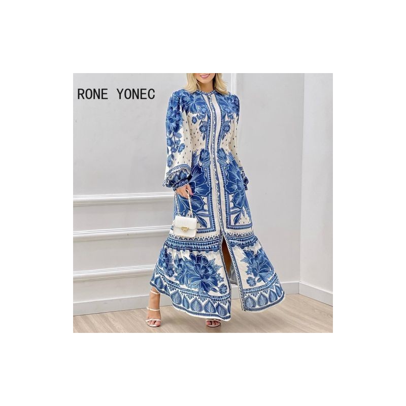 Női sikkes, mindenhol nyomtatott körgallér gombos lámpás ujjú fodros szegélyű maxi A-vonalú ruha