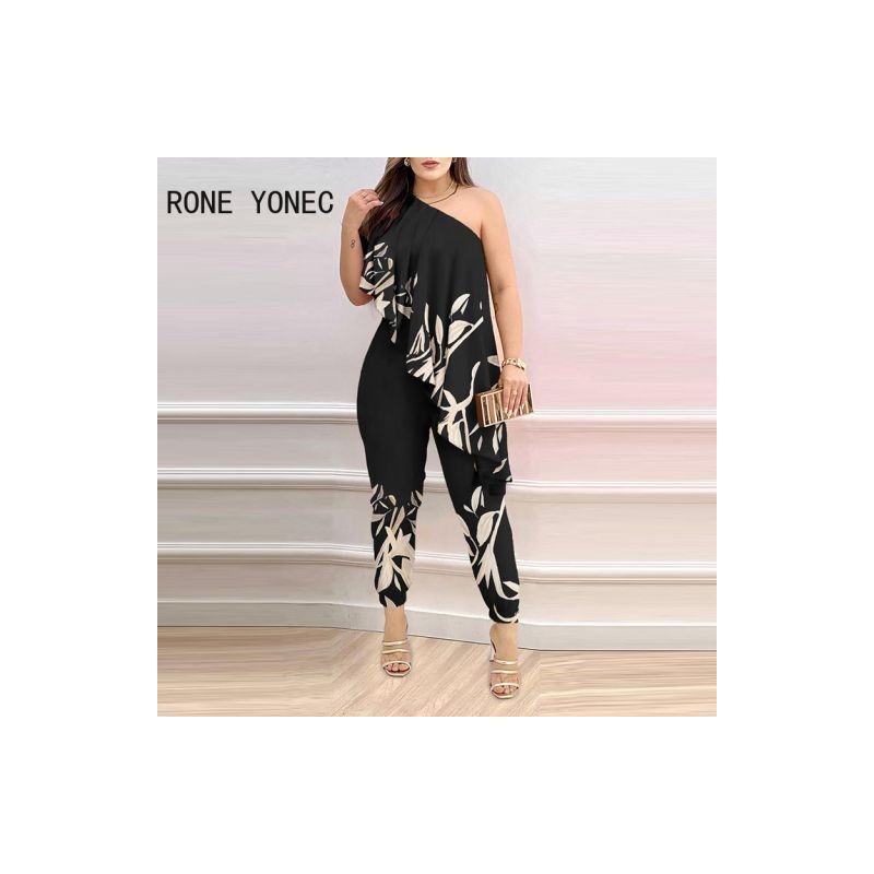 2023 Women Elegant Sexy All Over Print Diagonal Collar Asymmetrical Elastic Waist Ankle Length Pants Sets