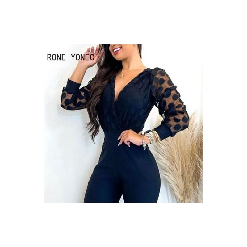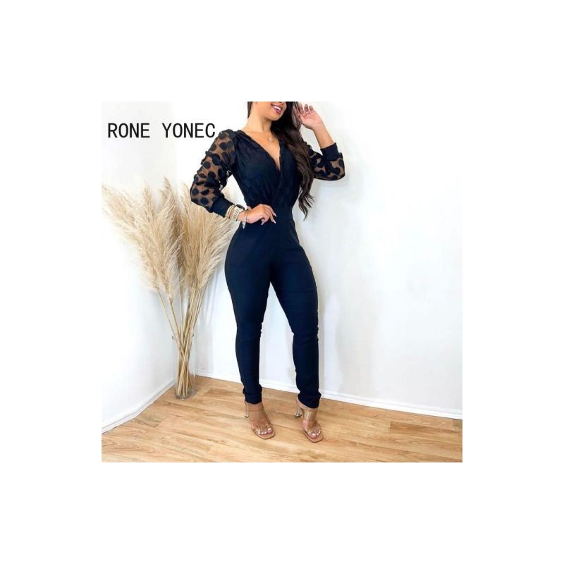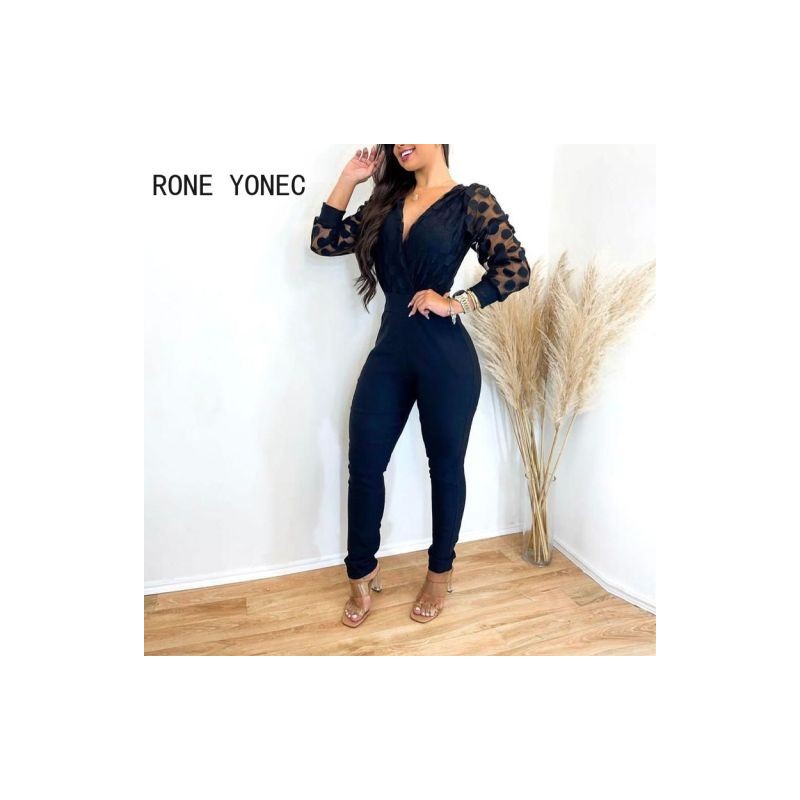 Női elegáns, mély V nyakú lámpás ujjú cipzárral működő vékony ceruza nadrág jumpsuit