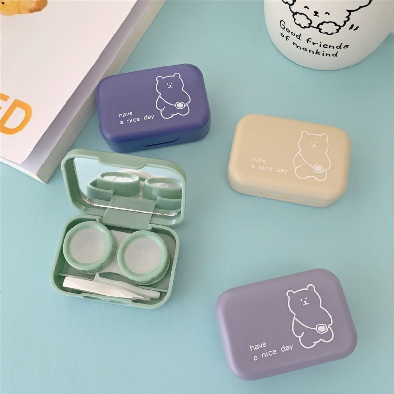 New Girl Contact Lens Case Colored Lenses Container Box for Party Travel Set Cute Small Backpack Bear Eye Contacts with Mirror