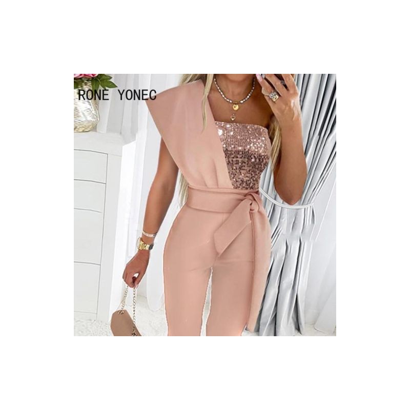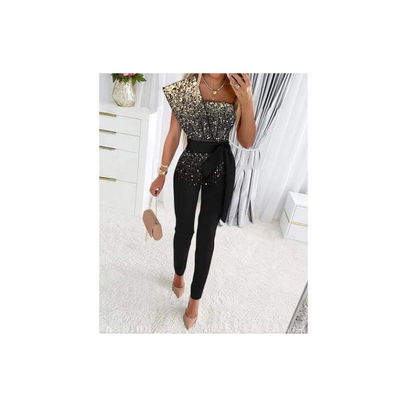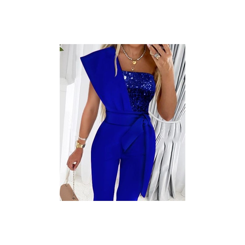 Women Elegant Contrast Sequin One Shoulder Tied Detail Sleeveless Jumpsuit