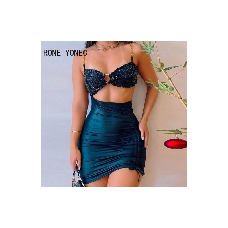Női szexi elegáns spagetti láncpántos flitterek patchwork ráncos mini szexi parti ruhák