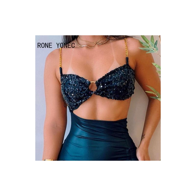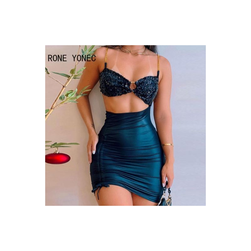 Women Sexy Elegant Spaghetti Chain Strap Sequins Patchwork Shirring Mini Sexy Party Dresses