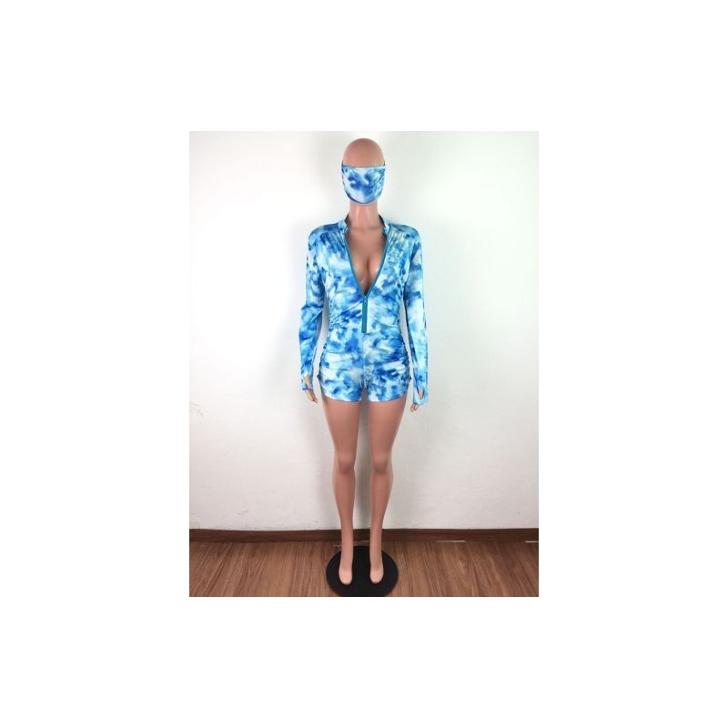 Streetwear Tie Dye Print One Piece Playsuit Vintage Deep V Neck Long Sleeve Sporty Bodysuit Active Zipper Front Bodycon Rompers