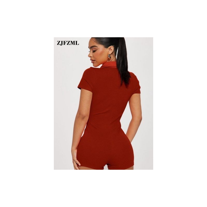 High Street Solid Fitness Rompers Womens Jumpsuit Sexy Polo Necked Short Sleeve Zipper Front Bodycon One Piece Club Playsuit Y2k