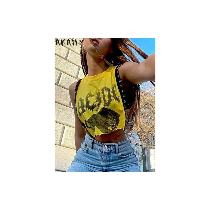 Akaily Summer Street Looe Graphic Női pólók 2022 O nyakú, ujjatlan nyomtatott felsők Női alkalmi divatos fekete póló
