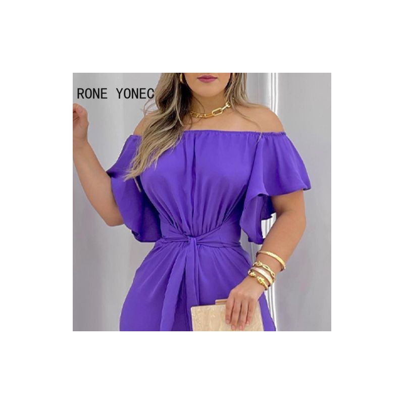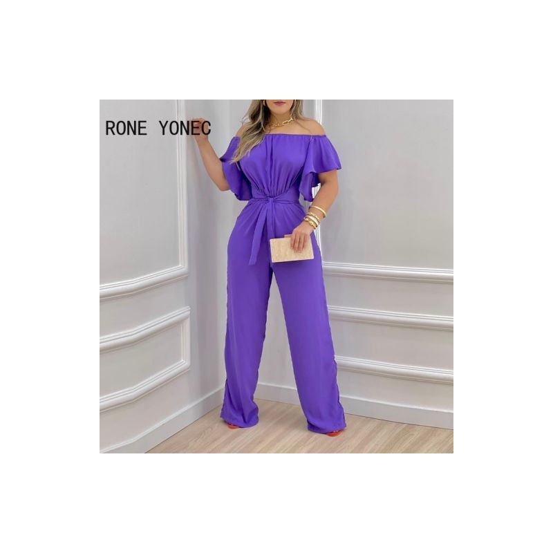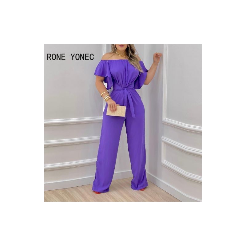 Women Elegant Solid Short Ruffle Sleeves Slash Collar Lace Up Straight Leg Casual Working Jumpsuit
