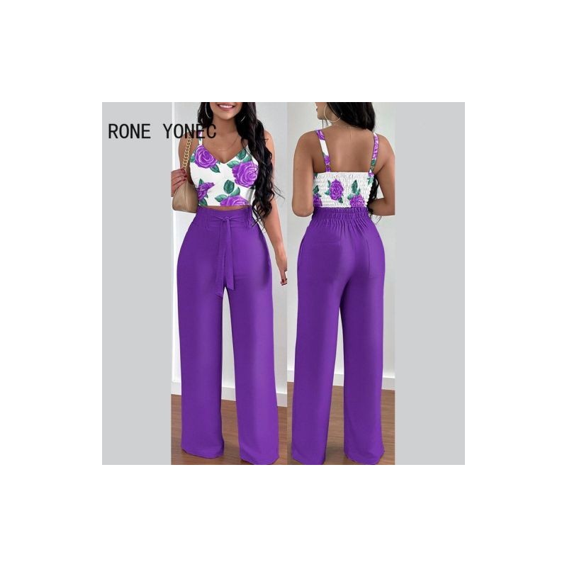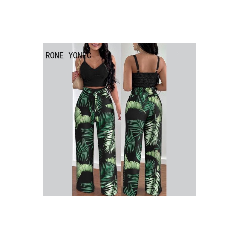 Women Fashion Chic Solid Sleeveless Lace Up V Neck Crop Top Pleated Long Straight Sexy Pants Sets