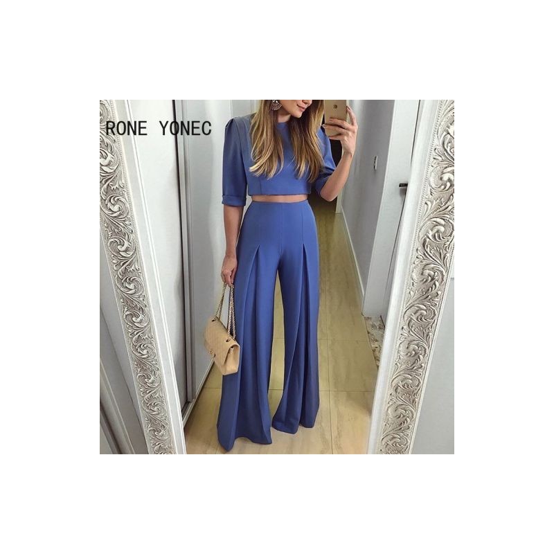 Women Solid Chic Half Sleeves Crop Top Long Straight Pants Casual Working Pants Sets