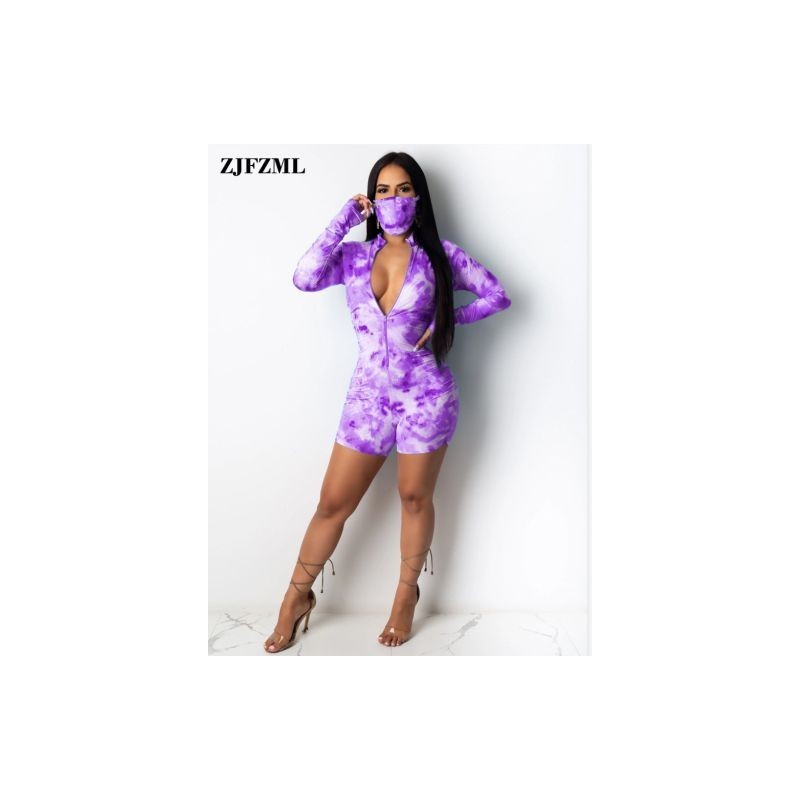 Streetwear Tie Dye Print One Piece Playsuit Vintage Deep V Neck Long Sleeve Sporty Bodysuit Active Zipper Front Bodycon Rompers