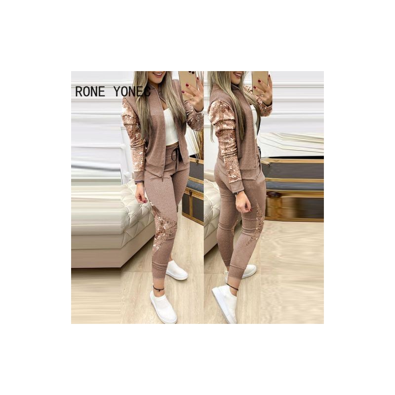 Women Casual Long Sleeves Sequins Patchwork Stand Collar Lace Up Sporty Patchwork Pants Sets
